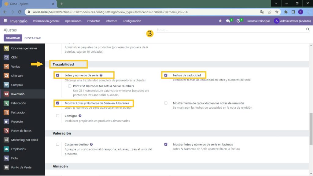 3) Marcamos con un check "Lotes y números de serie", "Mostrar Lotes y Números de serie en Albaranes" y "Fechas de caducidad".