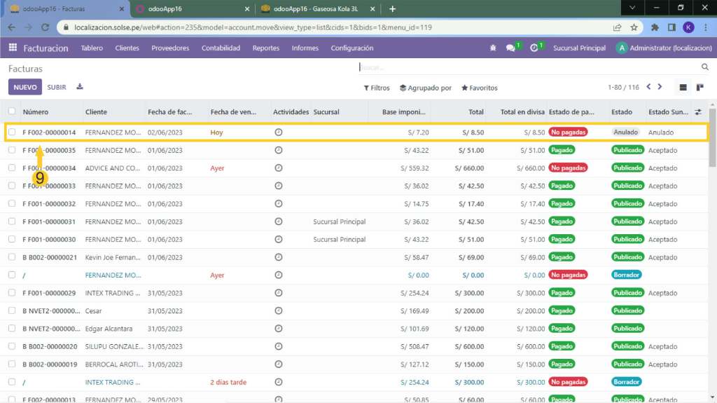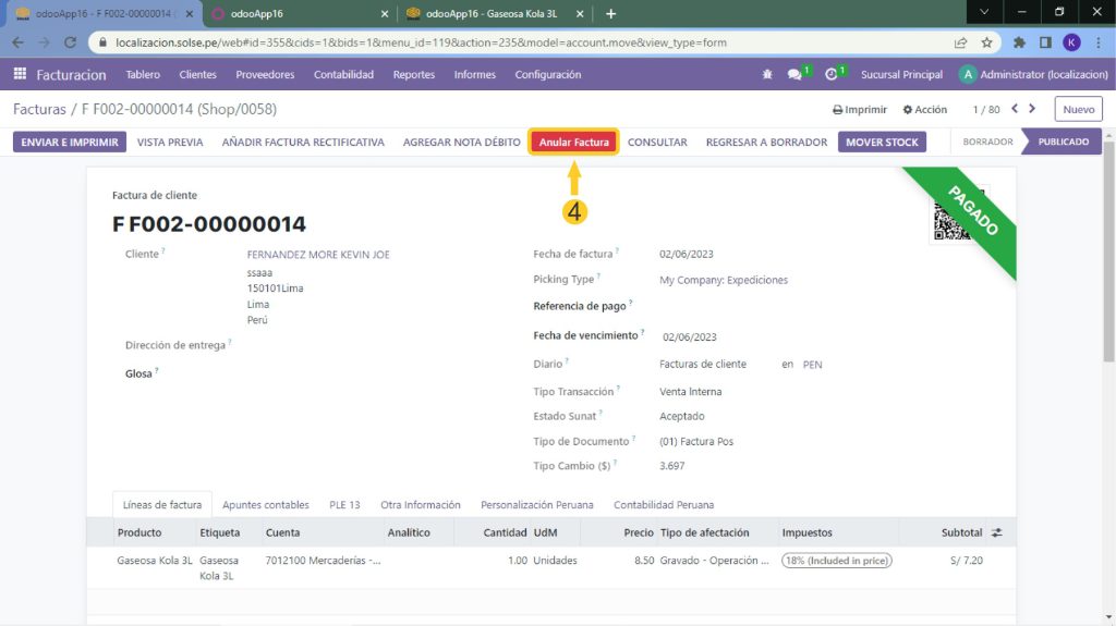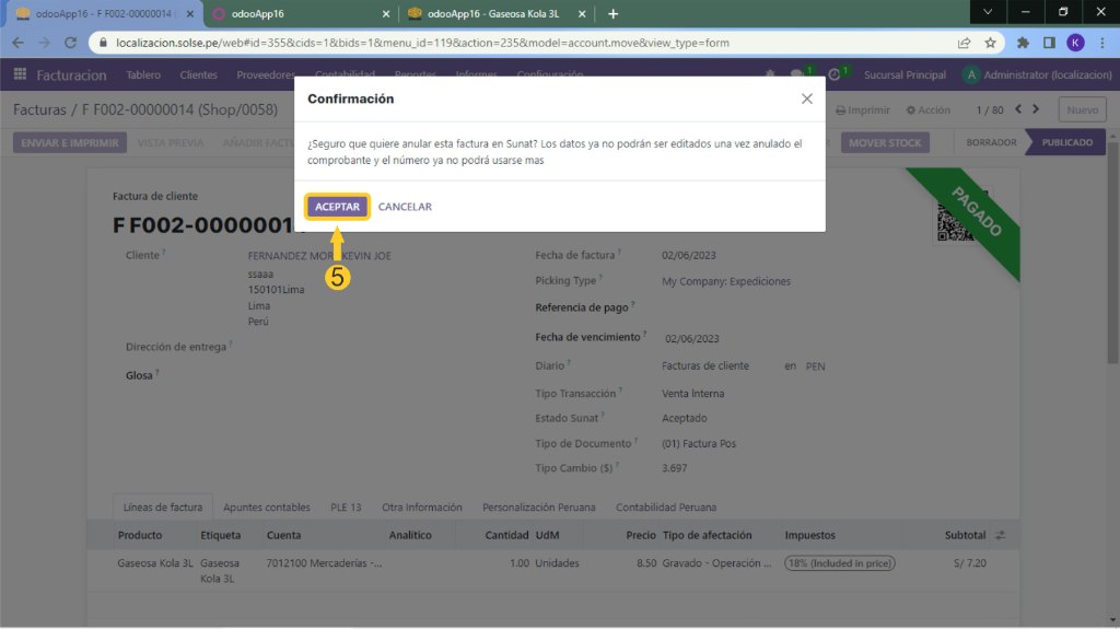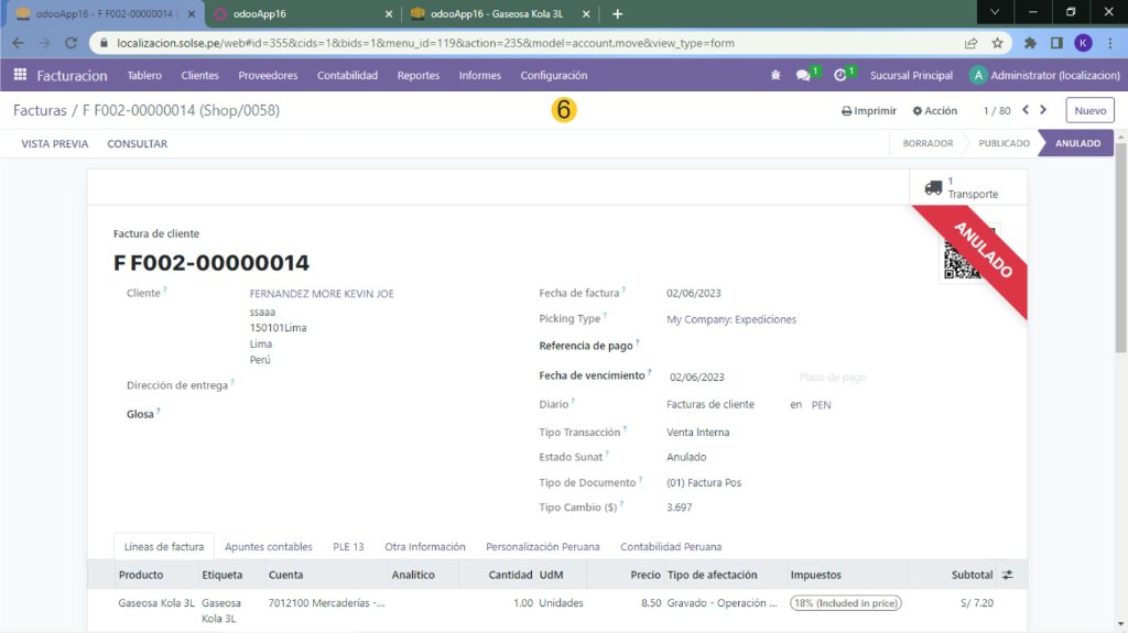 6) Ya estará anulada la factura, una vez que anulamos el producto regresará al stock.